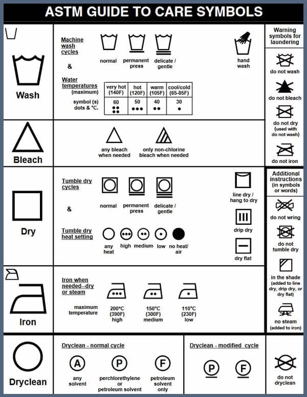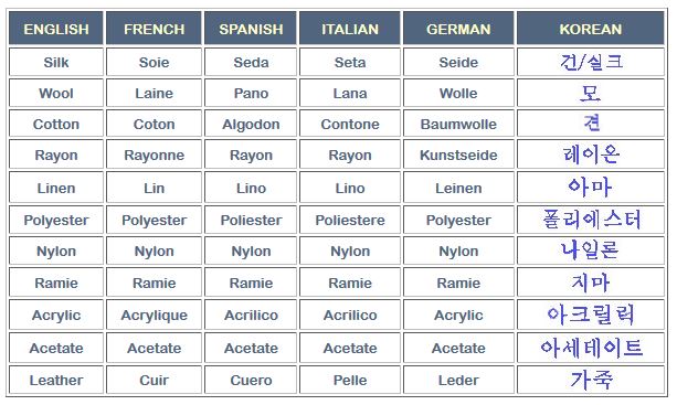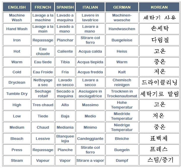 The written care instructions or fabric names on a care label are sometimes in another language. Here is a list of names and terms in the most commonly seen languages.