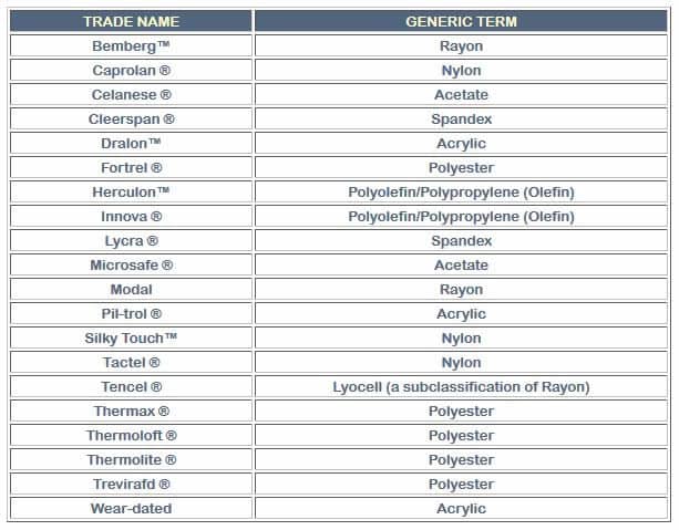 If you ever see the name of a fiber on a content label that you don’t recognize, it is probably a trade name. Please see the list of commonly seen trade names and their generic or family name.